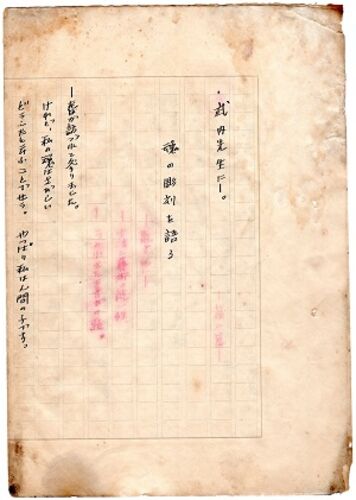 武内勝氏宛文書 工藤豊八氏(元毎日新聞社会部記者)草稿 第二篇 武内先生に――。 魂の彫刻を語る ――散文的に―― ――生活と芸術の統一性 ――一つの小さな喜びの歌。――春が訪づれて参りました。 けれど、私の魂はさびしい どうしたと云ふことでせう。やっぱり私は…